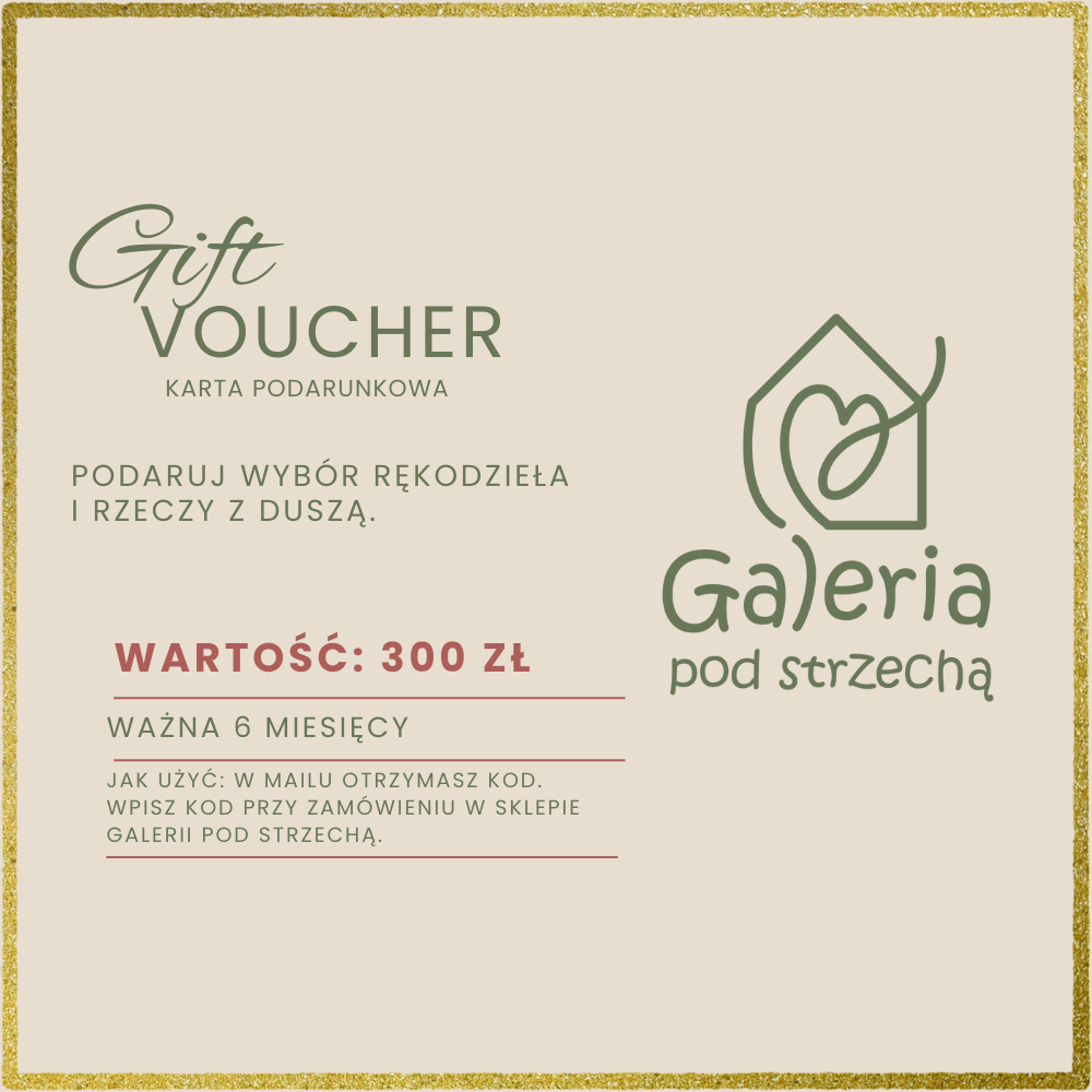 Karta o wartości 300 zł może zostać wykorzystana na dowolne rękodzieło dostępne w Galerii pod Strzechą — od mis i kubków, po liściaste talerze, rzeźbione formy i pojedyncze egzemplarze, których nie znajdziesz nigdzie indziej.
