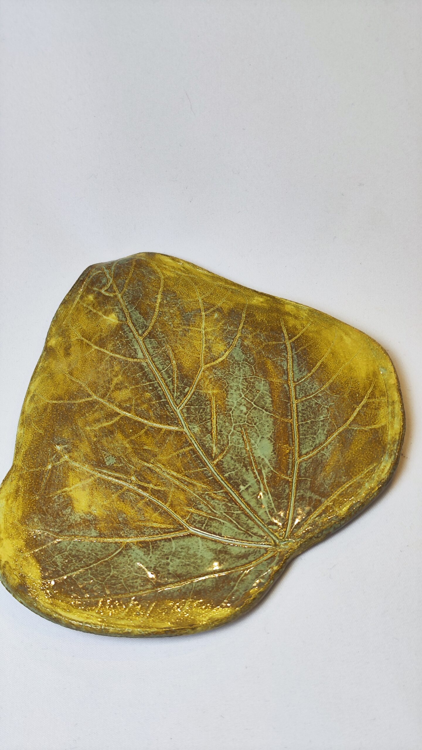 Ceramiczny talerz w kształcie liścia z Kolekcji Jesiennej — ręcznie formowany, szkliwiony w odcieniach zieleni i brązu.